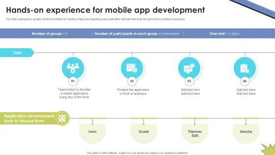 This slide represents a sample hands-on template for training employees regarding using application development tools and giving them practical experience. If your project calls for a presentation, then Slidegeeks is your go-to partner because we have professionally designed, easy-to-edit templates that are perfect for any presentation. After downloading, you can easily edit Hands On Experience For Mobile Skill Building Plan For Application PPT PowerPoint DTE SS V and make the changes accordingly. You can rearrange slides or fill them with different images. Check out all the handy templates This slide represents a sample hands-on template for training employees regarding using application development tools and giving them practical experience.