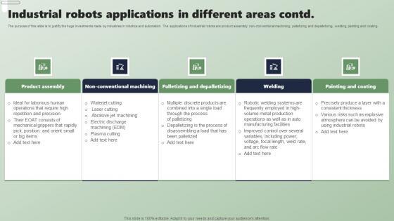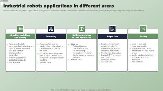 The purpose of this slide is to justify the huge investments made by industries in robotics and automation. The applications explained in this slide are grinding, polishing, buffing, deburring, loading and unloading, inspection and sorting. Coming up with a presentation necessitates that the majority of the effort goes into the content and the message you intend to convey. The visuals of a PowerPoint presentation can only be effective if it supplements and supports the story that is being told. Keeping this in mind our experts created Industrial Robots Applications In Different Areas Applications Of Industrial Robots Topics Pdf to reduce the time that goes into designing the presentation. This way, you can concentrate on the message while our designers take care of providing you with the right template for the situation. The purpose of this slide is to justify the huge investments made by industries in robotics and automation. The applications explained in this slide are grinding, polishing, buffing, deburring, loading and unloading, inspection and sorting.