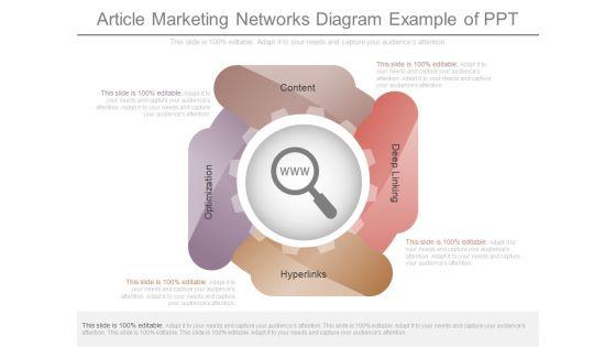 This is a article marketing networks diagram example of ppt. This is a four stage process. The stages in this process are content, optimization, hyperlinks, deep linking.