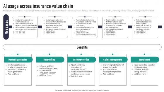 This slide showcases AI usage in insurance supply chain that can help to achieve operational efficiency and reduce expenses. It shows use cases in different areas like marketing, underwriting, customer service, claims management and recruitment.Explore a selection of the finest Ai Usage Across Insurance Value Chain Artificial Intelligence Applications Pictures Pdf here. With a plethora of professionally designed and pre-made slide templates, you can quickly and easily find the right one for your upcoming presentation. You can use our Ai Usage Across Insurance Value Chain Artificial Intelligence Applications Pictures Pdf to effectively convey your message to a wider audience. Slidegeeks has done a lot of research before preparing these presentation templates. The content can be personalized and the slides are highly editable. Grab templates today from Slidegeeks. This slide showcases AI usage in insurance supply chain that can help to achieve operational efficiency and reduce expenses. It shows use cases in different areas like marketing, underwriting, customer service, claims management and recruitment.
