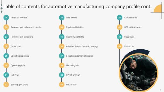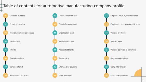 Get a simple yet stunning designed Table Of Contents For Automotive Manufacturing Company Profile CP SS V. It is the best one to establish the tone in your meetings. It is an excellent way to make your presentations highly effective. So, download this PPT today from Slidegeeks and see the positive impacts. Our easy-to-edit Table Of Contents For Automotive Manufacturing Company Profile CP SS V can be your go-to option for all upcoming conferences and meetings. So, what are you waiting for Grab this template today. Our Table Of Contents For Automotive Manufacturing Company Profile CP SS V are topically designed to provide an attractive backdrop to any subject. Use them to look like a presentation pro.