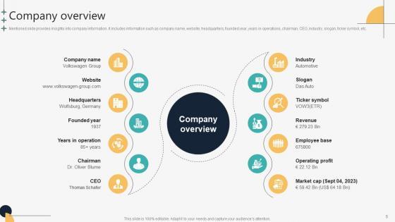 Following slide provides executive summary of Volkswagen company which present company description, key statistics, production sites, vehicle production volume, sales volume, key executives and business divisions.If you are looking for a format to display your unique thoughts, then the professionally designed Executive Summary Automotive Manufacturing Company Profile CP SS V is the one for you. You can use it as a Google Slides template or a PowerPoint template. Incorporate impressive visuals, symbols, images, and other charts. Modify or reorganize the text boxes as you desire. Experiment with shade schemes and font pairings. Alter, share or cooperate with other people on your work. Download Executive Summary Automotive Manufacturing Company Profile CP SS V and find out how to give a successful presentation. Present a perfect display to your team and make your presentation unforgettable. Following slide provides executive summary of Volkswagen company which present company description, key statistics, production sites, vehicle production volume, sales volume, key executives and business divisions.