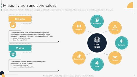 Mentioned slide provides information about company guiding principles. It includes a mission statement, vision statement, and core values such as responsibilities, honesty, bravery, diversity, etc.The best PPT templates are a great way to save time, energy, and resources. Slidegeeks have 100 percent editable powerpoint slides making them incredibly versatile. With these quality presentation templates, you can create a captivating and memorable presentation by combining visually appealing slides and effectively communicating your message. Download Mission Vision And Core Values Automotive Manufacturing Company Profile CP SS V from Slidegeeks and deliver a wonderful presentation. Mentioned slide provides information about company guiding principles. It includes a mission statement, vision statement, and core values such as responsibilities, honesty, bravery, diversity, etc.