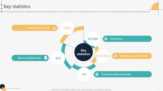 The mentioned slide includes key statistics associated with company working. It includes key statistics such as business revenue, profit before tax, number of production plants, vehicles produced, and employee base.Welcome to our selection of the Key Statistics Automotive Manufacturing Company Profile CP SS V. These are designed to help you showcase your creativity and bring your sphere to life. Planning and Innovation are essential for any business that is just starting out. This collection contains the designs that you need for your everyday presentations. All of our PowerPoints are 100 percent editable, so you can customize them to suit your needs. This multi-purpose template can be used in various situations. Grab these presentation templates today. The mentioned slide includes key statistics associated with company working. It includes key statistics such as business revenue, profit before tax, number of production plants, vehicles produced, and employee base.