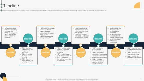 Mentioned slide provides information about company historical timeline. It includes information about business expansion, production units, car launches, establishments, etc.From laying roadmaps to briefing everything in detail, our templates are perfect for you. You can set the stage with your presentation slides. All you have to do is download these easy-to-edit and customizable templates. Timeline Automotive Manufacturing Company Profile CP SS V will help you deliver an outstanding performance that everyone would remember and praise you for. Do download this presentation today. Mentioned slide provides information about company historical timeline. It includes information about business expansion, production units, car launches, establishments, etc.