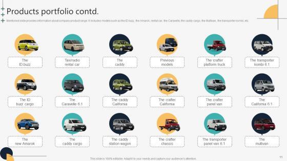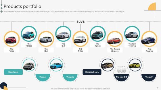 Mentioned slide provides information about company product range. It includes models such as SUVs, Small cars the up and the polo , and compact cars the new ID3 and the golf .Here you can discover an assortment of the finest PowerPoint and Google Slides templates. With these templates, you can create presentations for a variety of purposes while simultaneously providing your audience with an eye-catching visual experience. Download Products Portfolio Automotive Manufacturing Company Profile CP SS V to deliver an impeccable presentation. These templates will make your job of preparing presentations much quicker, yet still, maintain a high level of quality. Slidegeeks has experienced researchers who prepare these templates and write high-quality content for you. Later on, you can personalize the content by editing the Products Portfolio Automotive Manufacturing Company Profile CP SS V. Mentioned slide provides information about company product range. It includes models such as SUVs, Small cars andthe up and the poloand, and compact cars andthe new ID3 and the golfand.