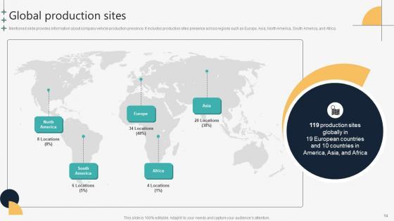 Mentioned slide provides information about company vehicle production presence. It includes production sites presence across regions such as Europe, Asia, North America, South America, and Africa. Make sure to capture your audiences attention in your business displays with our gratis customizable Global Production Sites Automotive Manufacturing Company Profile CP SS V. These are great for business strategies, office conferences, capital raising or task suggestions. If you desire to acquire more customers for your tech business and ensure they stay satisfied, create your own sales presentation with these plain slides. Mentioned slide provides information about company vehicle production presence. It includes production sites presence across regions such as Europe, Asia, North America, South America, and Africa.