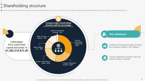 Mentioned slide provides information about company shareholding pattern. It includes the number of subscribed capital, shareholding in percentage by different holding companies, institutional investors, etc.Boost your pitch with our creative Shareholding Structure Automotive Manufacturing Company Profile CP SS V. Deliver an awe-inspiring pitch that will mesmerize everyone. Using these presentation templates you will surely catch everyones attention. You can browse the ppts collection on our website. We have researchers who are experts at creating the right content for the templates. So you do not have to invest time in any additional work. Just grab the template now and use them. Mentioned slide provides information about company shareholding pattern. It includes the number of subscribed capital, shareholding in percentage by different holding companies, institutional investors, etc.