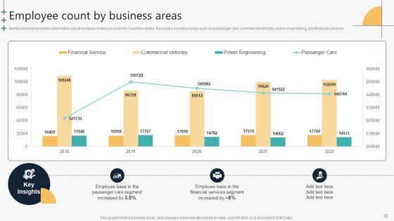 Mentioned slide provides information about company employee count by business areas. It includes business areas such as passenger cars, commercial vehicles, power engineering, and financial services.Whether you have daily or monthly meetings, a brilliant presentation is necessary. Employee Count By Business Areas Automotive Manufacturing Company Profile CP SS V can be your best option for delivering a presentation. Represent everything in detail using Employee Count By Business Areas Automotive Manufacturing Company Profile CP SS V and make yourself stand out in meetings. The template is versatile and follows a structure that will cater to your requirements. All the templates prepared by Slidegeeks are easy to download and edit. Our research experts have taken care of the corporate themes as well. So, give it a try and see the results. Mentioned slide provides information about company employee count by business areas. It includes business areas such as passenger cars, commercial vehicles, power engineering, and financial services.
