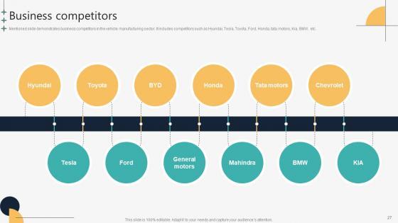 Mentioned slide demonstrates business competitors in the vehicle manufacturing sector. It includes competitors such as Hyundai, Tesla, Toyota, Ford, Honda, tata motors, Kia, BMW, etc.Create an editable Business Competitors Automotive Manufacturing Company Profile CP SS V that communicates your idea and engages your audience. Whether you are presenting a business or an educational presentation, pre-designed presentation templates help save time. Business Competitors Automotive Manufacturing Company Profile CP SS V is highly customizable and very easy to edit, covering many different styles from creative to business presentations. Slidegeeks has creative team members who have crafted amazing templates. So, go and get them without any delay. Mentioned slide demonstrates business competitors in the vehicle manufacturing sector. It includes competitors such as Hyundai, Tesla, Toyota, Ford, Honda, tata motors, Kia, BMW, etc.