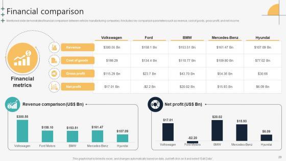 Mentioned slide demonstrates financial comparison between vehicle manufacturing companies. It includes key comparison parameters such as revenue, cost of goods, gross profit, and net income.Are you in need of a template that can accommodate all of your creative concepts This one is crafted professionally and can be altered to fit any style. Use it with Google Slides or PowerPoint. Include striking photographs, symbols, depictions, and other visuals. Fill, move around, or remove text boxes as desired. Test out color palettes and font mixtures. Edit and save your work, or work with colleagues. Download Financial Comparison Automotive Manufacturing Company Profile CP SS V and observe how to make your presentation outstanding. Give an impeccable presentation to your group and make your presentation unforgettable. Mentioned slide demonstrates financial comparison between vehicle manufacturing companies. It includes key comparison parameters such as revenue, cost of goods, gross profit, and net income.
