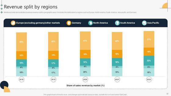 Mentioned slide demonstrates business revenue split by geographic area. It includes the distribution by regions such as Europe. North America, South America, Asia-pacific, and Germany. Do you know about Slidesgeeks Revenue Split By Regions Automotive Manufacturing Company Profile CP SS V These are perfect for delivering any kind od presentation. Using it, create PowerPoint presentations that communicate your ideas and engage audiences. Save time and effort by using our pre-designed presentation templates that are perfect for a wide range of topic. Our vast selection of designs covers a range of styles, from creative to business, and are all highly customizable and easy to edit. Download as a PowerPoint template or use them as Google Slides themes. Mentioned slide demonstrates business revenue split by geographic area. It includes the distribution by regions such as Europe. North America, South America, Asia-pacific, and Germany.
