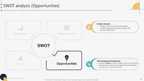 Following slide provides information about company opportunities for enhanced business growth. It includes key opportunities such as unique designs and technological development. Slidegeeks is one of the best resources for PowerPoint templates. You can download easily and regulate Swot Analysis Opportunities Automotive Manufacturing Company Profile CP SS V for your personal presentations from our wonderful collection. A few clicks is all it takes to discover and get the most relevant and appropriate templates. Use our Templates to add a unique zing and appeal to your presentation and meetings. All the slides are easy to edit and you can use them even for advertisement purposes. Following slide provides information about company opportunities for enhanced business growth. It includes key opportunities such as unique designs and technological development.