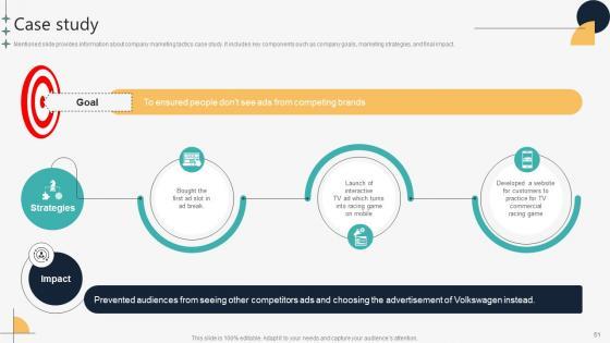 Mentioned slide provides information about company marketing tactics case study. It includes key components such as company goals, marketing strategies, and final impact.Want to ace your presentation in front of a live audience Our Case Study Automotive Manufacturing Company Profile CP SS V can help you do that by engaging all the users towards you. Slidegeeks experts have put their efforts and expertise into creating these impeccable powerpoint presentations so that you can communicate your ideas clearly. Moreover, all the templates are customizable, and easy-to-edit and downloadable. Use these for both personal and commercial use. Mentioned slide provides information about company marketing tactics case study. It includes key components such as company goals, marketing strategies, and final impact.