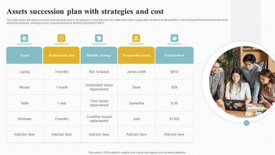 This slide shows the various number of assets that have to be replaced in near future for the betterment of the organisation and the smooth workflow. It also includes the time till when the asset Persuade your audience using this Assets Succession Plan With Strategies And Cost Icons PDF. This PPT design covers five stages, thus making it a great tool to use. It also caters to a variety of topics including Cost, Assets, Succession Plan. Download this PPT design now to present a convincing pitch that not only emphasizes the topic but also showcases your presentation skills.