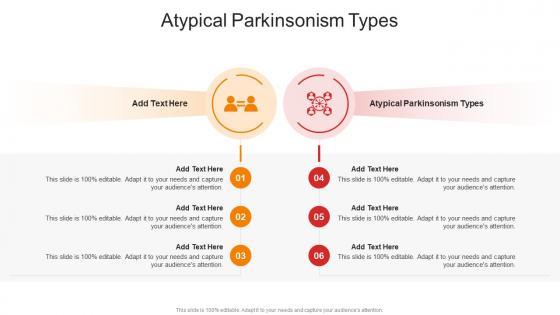 Introducing our well-designed Atypical Parkinsonism Types In Powerpoint And Google Slides Cpb. This PowerPoint design presents information on topics like Atypical Parkinsonism Types. As it is predesigned it helps boost your confidence level. It also makes you a better presenter because of its high-quality content and graphics. This PPT layout can be downloaded and used in different formats like PDF, PNG, and JPG. Not only this, it is available in both Standard Screen and Widescreen aspect ratios for your convenience. Therefore, click on the download button now to persuade and impress your audience. Our Atypical Parkinsonism Types In Powerpoint And Google Slides Cpb are topically designed to provide an attractive backdrop to any subject. Use them to look like a presentation pro.