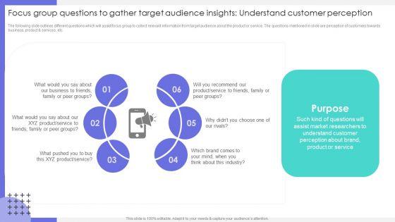 The following slide outlines different questions which will assist focus group to collect relevant information from target audience about the product or service. The questions mentioned in slide are perception of customers towards business, product and services, etc. Get a simple yet stunning designed Focus Group Questions To Gather Target Audience Insights Understand Customer Perception Ppt PowerPoint Presentation File Icon PDF. It is the best one to establish the tone in your meetings. It is an excellent way to make your presentations highly effective. So, download this PPT today from Slidegeeks and see the positive impacts. Our easy to edit Focus Group Questions To Gather Target Audience Insights Understand Customer Perception Ppt PowerPoint Presentation File Icon PDF can be your go to option for all upcoming conferences and meetings. So, what are you waiting for Grab this template today.
