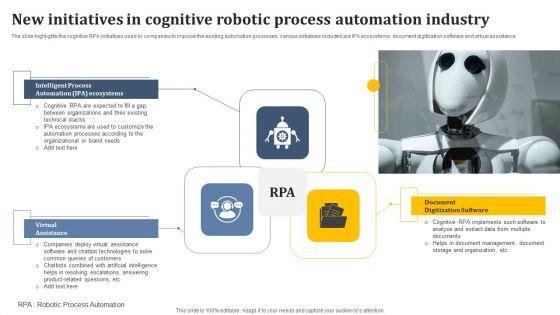 The slide highlights the cognitive RPA initiatives used by companies to improve the existing automation processes. Various initiatives included are IPA ecosystems, document digitization software and virtual assistance Persuade your audience using this New Initiatives In Cognitive Robotic Process Automation Industry Template PDF. This PPT design covers three stages, thus making it a great tool to use. It also caters to a variety of topics including Ecosystems, Virtual Assistance, Document Digitization Software. Download this PPT design now to present a convincing pitch that not only emphasizes the topic but also showcases your presentation skills.