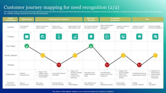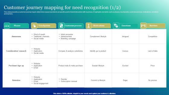 This slide presents a customer journey map to determine issues and problems at specific point of client interaction with business. It highlights elements such as phases, touchpoints, customer process, motivations, emotions and barriers.Present like a pro with Customer Journey Mapping For Need Marketing And Promotion Automation Designs Pdf Create beautiful presentations together with your team, using our easy-to-use presentation slides. Share your ideas in real-time and make changes on the fly by downloading our templates. So whether you are in the office, on the go, or in a remote location, you can stay in sync with your team and present your ideas with confidence. With Slidegeeks presentation got a whole lot easier. Grab these presentations today. This slide presents a customer journey map to determine issues and problems at specific point of client interaction with business. It highlights elements such as phases, touchpoints, customer process, motivations, emotions and barriers.