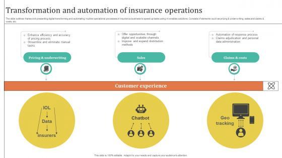 The slide outlines framework presenting digital transforming and automating routine operational processes in insurance business to speed up tasks using AI enables solutions. Consists of elements such as pricing and underwriting, sales and claims and costs, etc. Slidegeeks has constructed Improving Customer Satisfaction Transformation And Automation Of Insurance Operations after conducting extensive research and examination. These presentation templates are constantly being generated and modified based on user preferences and critiques from editors. Here, you will find the most attractive templates for a range of purposes while taking into account ratings and remarks from users regarding the content. This is an excellent jumping-off point to explore our content and will give new users an insight into our top-notch PowerPoint Templates. The slide outlines framework presenting digital transforming and automating routine operational processes in insurance business to speed up tasks using AI enables solutions. Consists of elements such as pricing and underwriting, sales and claims and costs, etc.