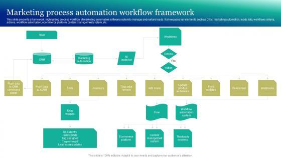 This slide presents a framework highlighting process workflow of marketing automation software system to manage and nurture leads. It showcases key elements such as CRM, marketing automation, leads lists, workflows criteria, actions, workflow automation, ecommerce platform, content management system, etc. Find highly impressive Comprehensive Guide For Sales And Advertising Processes Marketing Process Automation Workflow Framework Ideas PDF on Slidegeeks to deliver a meaningful presentation. You can save an ample amount of time using these presentation templates. No need to worry to prepare everything from scratch because Slidegeeks experts have already done a huge research and work for you. You need to download Comprehensive Guide For Sales And Advertising Processes Marketing Process Automation Workflow Framework Ideas PDF for your upcoming presentation. All the presentation templates are 100 percent editable and you can change the color and personalize the content accordingly. Download now