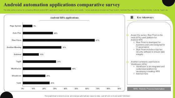 The slide carries a survey for comparing different android RPA applications based on user ratings and usability. Various applications included are Pega System, Automate Plus, Blue Prism, Another Monday, Automai, TagUI, etc Pitch your topic with ease and precision using this Android Automation Applications Comparative Survey Pictures PDF. This layout presents information on Applications, Key Takeaways, Survey. It is also available for immediate download and adjustment. So, changes can be made in the color, design, graphics or any other component to create a unique layout.
