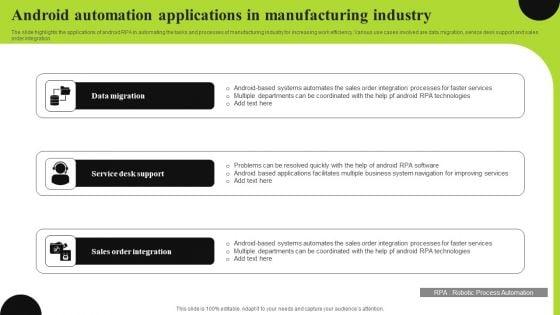 The slide highlights the applications of android RPA in automating the tasks and processes of manufacturing industry for increasing work efficiency. Various use cases involved are data migration, service desk support and sales order integration Presenting Android Automation Applications In Manufacturing Industry Brochure PDF to dispense important information. This template comprises three stages. It also presents valuable insights into the topics including Data Migration, Service Desk Support, Order Integration. This is a completely customizable PowerPoint theme that can be put to use immediately. So, download it and address the topic impactfully.