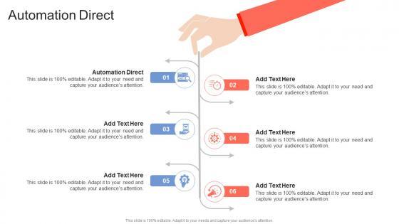 Presenting our innovatively designed set of slides titled Automation Direct In Powerpoint And Google Slides Cpb This completely editable PowerPoint graphic exhibits Automation Direct that will help you convey the message impactfully. It can be accessed with Google Slides and is available in both standard screen and widescreen aspect ratios. Apart from this, you can download this well structured PowerPoint template design in different formats like PDF, JPG, and PNG. So, click the download button now to gain full access to this PPT design. Our Automation Direct In Powerpoint And Google Slides Cpb are topically designed to provide an attractive backdrop to any subject. Use them to look like a presentation pro.
