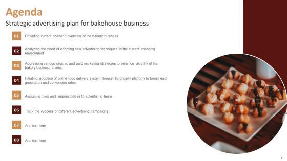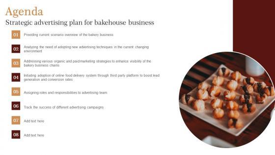 Retrieve professionally designed Agenda Strategic Advertising Plan For Bakehouse Business Infographics Pdf to effectively convey your message and captivate your listeners. Save time by selecting pre made slideshows that are appropriate for various topics, from business to educational purposes. These themes come in many different styles, from creative to corporate, and all of them are easily adjustable and can be edited quickly. Access them as PowerPoint templates or as Google Slides themes. You do not have to go on a hunt for the perfect presentation because Slidegeeks got you covered from everywhere. Our Agenda Strategic Advertising Plan For Bakehouse Business Infographics Pdf are topically designed to provide an attractive backdrop to any subject. Use them to look like a presentation pro.