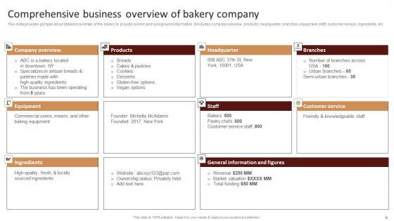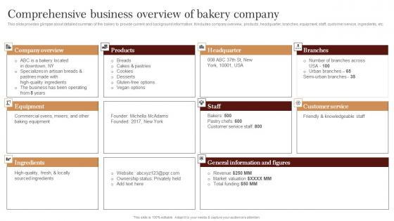 This slide provides glimpse about detailed summary of the bakery to provide current and background information. It includes company overview, products, headquarter, branches, equipment, staff, customer service, ingredients, etc.Create an editable Comprehensive Business Overview Of Strategic Advertising Plan For Bakehouse Infographics Pdf that communicates your idea and engages your audience. Whether you are presenting a business or an educational presentation, pre designed presentation templates help save time. Comprehensive Business Overview Of Strategic Advertising Plan For Bakehouse Infographics Pdf is highly customizable and very easy to edit, covering many different styles from creative to business presentations. Slidegeeks has creative team members who have crafted amazing templates. So, go and get them without any delay. This slide provides glimpse about detailed summary of the bakery to provide current and background information. It includes company overview, products, headquarter, branches, equipment, staff, customer service, ingredients, etc.