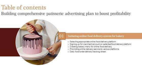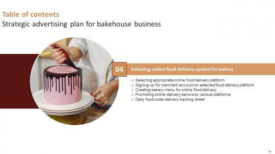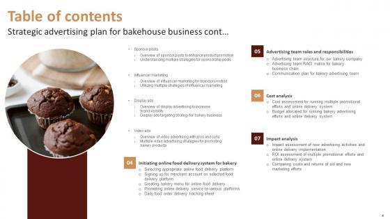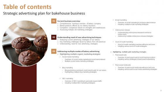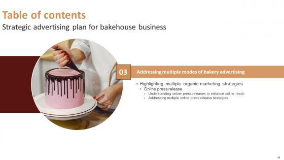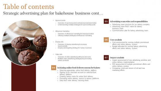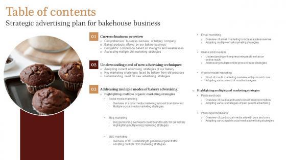 Take your projects to the next level with our ultimate collection of Table Of Contents Strategic Advertising Plan For Bakehouse Business Mockup Pdf. Slidegeeks has designed a range of layouts that are perfect for representing task or activity duration, keeping track of all your deadlines at a glance. Tailor these designs to your exact needs and give them a truly corporate look with your own brand colors they all make your projects stand out from the rest. Our Table Of Contents Strategic Advertising Plan For Bakehouse Business Mockup Pdf are topically designed to provide an attractive backdrop to any subject. Use them to look like a presentation pro.