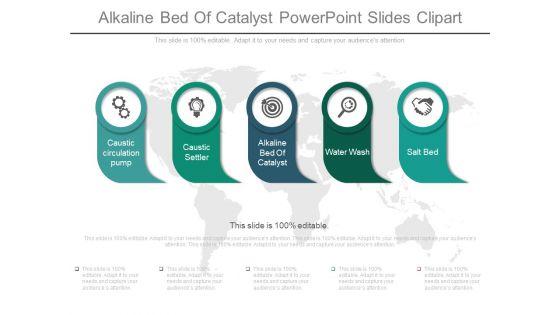 This is a alkaline bed of catalyst powerpoint slides clipart. This is a five stage process. The stages in this process are caustic circulation pump, caustic settler, alkaline bed of catalyst, water wash, salt bed.