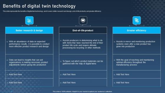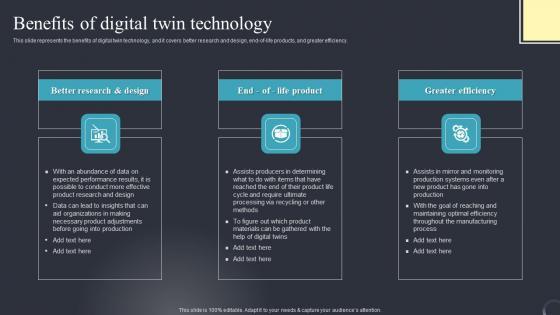 This slide represents the benefits of digital twin technology, and it covers better research and design, end-of-life products, and greater efficiency. There are so many reasons you need a Benefits Of Digital Twin Technology Digital Twins For Enhanced Industrial Introduction Pdf. The first reason is you can not spend time making everything from scratch, Thus, Slidegeeks has made presentation templates for you too. You can easily download these templates from our website easily. This slide represents the benefits of digital twin technology, and it covers better research and design, end-of-life products, and greater efficiency.