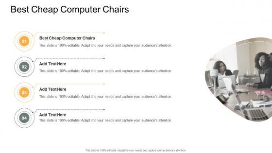 Introducing our well-designed Best Cheap Computer Chairs In Powerpoint And Google Slides Cpb. This PowerPoint design presents information on topics like Best Cheap Computer Chairs. As it is predesigned it helps boost your confidence level. It also makes you a better presenter because of its high-quality content and graphics. This PPT layout can be downloaded and used in different formats like PDF, PNG, and JPG. Not only this, it is available in both Standard Screen and Widescreen aspect ratios for your convenience. Therefore, click on the download button now to persuade and impress your audience. Our Best Cheap Computer Chairs In Powerpoint And Google Slides Cpb are topically designed to provide an attractive backdrop to any subject. Use them to look like a presentation pro.