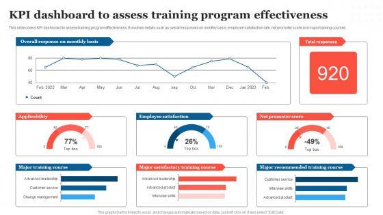 This slide covers KPI dashboard to assess training program effectiveness. It involves details such as overall responses on monthly basis, employee satisfaction rate, net promoter score and major training courses. Here you can discover an assortment of the finest PowerPoint and Google Slides templates. With these templates, you can create presentations for a variety of purposes while simultaneously providing your audience with an eye catching visual experience. Download KPI Dashboard To Assess Training Program Effectiveness Formats PDF to deliver an impeccable presentation. These templates will make your job of preparing presentations much quicker, yet still, maintain a high level of quality. Slidegeeks has experienced researchers who prepare these templates and write high quality content for you. Later on, you can personalize the content by editing the KPI Dashboard To Assess Training Program Effectiveness Formats PDF.
