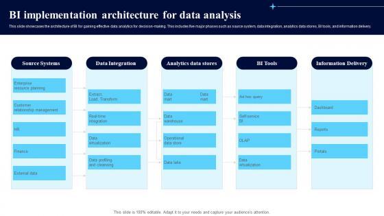 This slide showcases the architecture of BI for gaining effective data analytics for decision-making. This includes five major phases such as source system, data integration, analytics data stores, BI tools, and information delivery. Showcasing this set of slides titled BI Implementation Architecture For Data Analysis Slides Pdf. The topics addressed in these templates are Source Systems, Data Integration, Analytics Data Stores. All the content presented in this PPT design is completely editable. Download it and make adjustments in color, background, font etc. as per your unique business setting. This slide showcases the architecture of BI for gaining effective data analytics for decision-making. This includes five major phases such as source system, data integration, analytics data stores, BI tools, and information delivery.