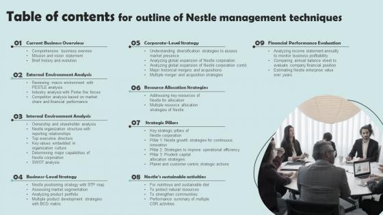 Do you know about Slidesgeeks Table Of Contents For Outline Of Nestle Management Techniques Graphics Pdf These are perfect for delivering any kind od presentation. Using it, create PowerPoint presentations that communicate your ideas and engage audiences. Save time and effort by using our pre-designed presentation templates that are perfect for a wide range of topic. Our vast selection of designs covers a range of styles, from creative to business, and are all highly customizable and easy to edit. Download as a PowerPoint template or use them as Google Slides themes. Our Table Of Contents For Outline Of Nestle Management Techniques Graphics Pdf are topically designed to provide an attractive backdrop to any subject. Use them to look like a presentation pro.