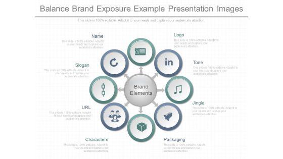 This is a balance brand exposure example presentation images. This is a eight stage process. The stages in this process are logo, tone, jingle, packaging, characters, url, slogan, name.