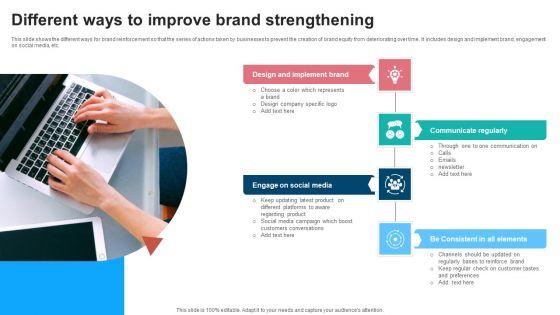 This slide shows the different ways for brand reinforcement so that the series of actions taken by businesses to prevent the creation of brand equity from deteriorating over time. It includes design and implement brand, engagement on social media, etc. Presenting Different Ways To Improve Brand Strengthening Icons PDF to dispense important information. This template comprises four stages. It also presents valuable insights into the topics including Design Implement Brand, Communicate Regularly, Engage Social Media. This is a completely customizable PowerPoint theme that can be put to use immediately. So, download it and address the topic impactfully.