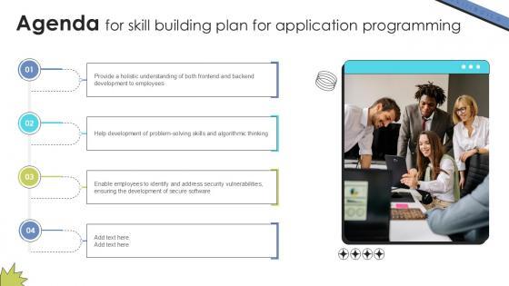Find a pre-designed and impeccable Agenda For Skill Building Plan For Application Programming PPT Template DTE SS V. The templates can ace your presentation without additional effort. You can download these easy-to-edit presentation templates to make your presentation stand out from others. So, what are you waiting for Download the template from Slidegeeks today and give a unique touch to your presentation. Our Agenda For Skill Building Plan For Application Programming PPT Template DTE SS V are topically designed to provide an attractive backdrop to any subject. Use them to look like a presentation pro.