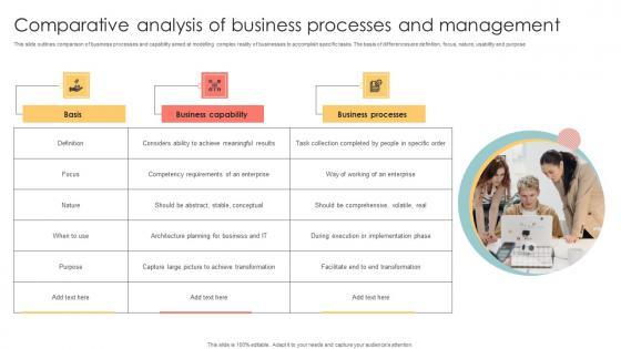 This slide outlines comparison of business processes and capability aimed at modelling complex reality of businesses to accomplish specific tasks. The basis of differences are definition, focus, nature, usability and purpose Showcasing this set of slides titled Comparative Analysis Of Business Processes And Management Structure Pdf. The topics addressed in these templates are Definition, Nature, Focus . All the content presented in this PPT design is completely editable. Download it and make adjustments in color, background, font etc. as per your unique business setting. This slide outlines comparison of business processes and capability aimed at modelling complex reality of businesses to accomplish specific tasks. The basis of differences are definition, focus, nature, usability and purpose