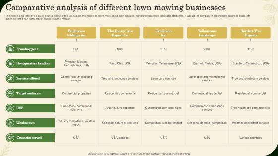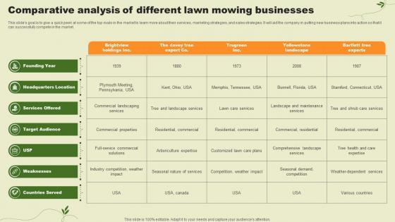 This slides goal is to give a quick peek at some of the top rivals in the market to learn more about their services, marketing strategies, and sales strategies. It will aid the company in putting new business plans into action so that it can successfully compete in the market. Do you have to make sure that everyone on your team knows about any specific topic I yes, then you should give Lawn Care Services Business Plan Comparative Analysis Of Different Lawn Mowing Businesses BP SS V a try. Our experts have put a lot of knowledge and effort into creating this impeccable Lawn Care Services Business Plan Comparative Analysis Of Different Lawn Mowing Businesses BP SS V. You can use this template for your upcoming presentations, as the slides are perfect to represent even the tiniest detail. You can download these templates from the Slidegeeks website and these are easy to edit. So grab these today. This slides goal is to give a quick peek at some of the top rivals in the market to learn more about their services, marketing strategies, and sales strategies. It will aid the company in putting new business plans into action so that it can successfully compete in the market.