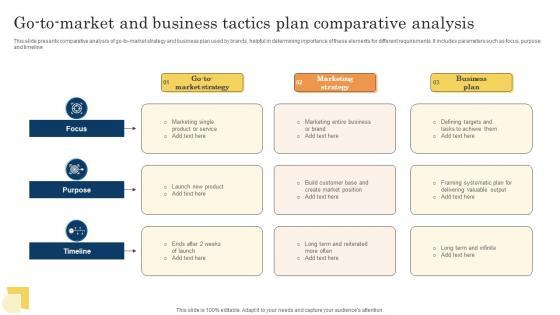 This slide presents comparative analysis of go to market strategy and business plan used by brands, helpful in determining importance of these elements for different requirements. It includes parameters such as focus, purpose and timeline Showcasing this set of slides titled Go To Market And Business Tactics Plan Comparative Analysis Icons Pdf. The topics addressed in these templates are Purpose, Timeline, Focus. All the content presented in this PPT design is completely editable. Download it and make adjustments in color, background, font etc. as per your unique business setting. This slide presents comparative analysis of go to market strategy and business plan used by brands, helpful in determining importance of these elements for different requirements. It includes parameters such as focus, purpose and timeline