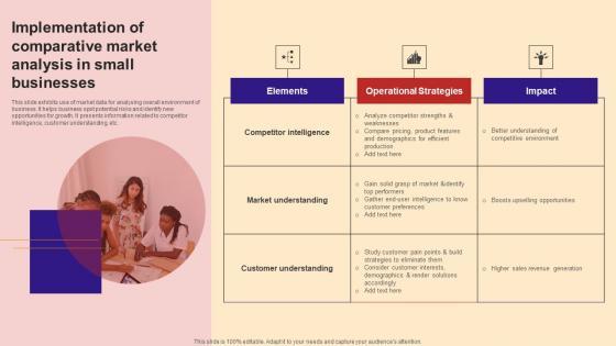 This slide exhibits use of market data for analysing overall environment of business. It helps business spot potential risks and identify new opportunities for growth. It presents information related to competitor intelligence, customer understanding, etc.Pitch your topic with ease and precision using this Implementation Of Comparative Market Analysis In Small Businesses Structure Pdf This layout presents information on Competitor Intelligence, Market Understanding, Customer Understanding It is also available for immediate download and adjustment. So, changes can be made in the color, design, graphics or any other component to create a unique layout. This slide exhibits use of market data for analysing overall environment of business. It helps business spot potential risks and identify new opportunities for growth. It presents information related to competitor intelligence, customer understanding, etc.