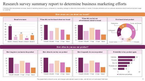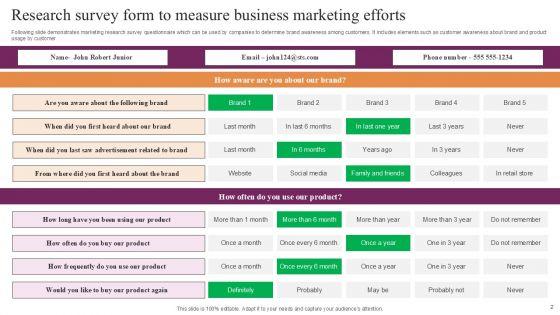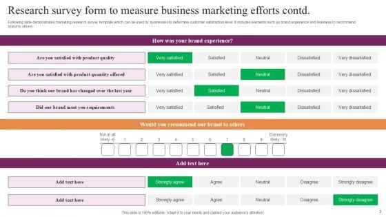Boost your confidence and team morale with this well-structured Business Marketing Research Ppt PowerPoint Presentation Complete Deck With Slides Survey. This prefabricated set gives a voice to your presentation because of its well-researched content and graphics. Our experts have added all the components very carefully, thus helping you deliver great presentations with a single click. Not only that, it contains a set of six slides that are designed using the right visuals, graphics, etc. Various topics can be discussed, and effective brainstorming sessions can be conducted using the wide variety of slides added in this complete deck. Apart from this, our PPT design contains clear instructions to help you restructure your presentations and create multiple variations. The color, format, design anything can be modified as deemed fit by the user. Not only this, it is available for immediate download. So, grab it now.