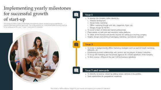 The purpose of this slide is to facilitate managers to convey project progress updates to stakeholders and get their approvals. The slide portrays key milestones of the trucking start up to be achieved in the year 1, year 3, and years 5 onwards. Are you in need of a template that can accommodate all of your creative concepts This one is crafted professionally and can be altered to fit any style. Use it with Google Slides or PowerPoint. Include striking photographs, symbols, depictions, and other visuals. Fill, move around, or remove text boxes as desired. Test out color palettes and font mixtures. Edit and save your work, or work with colleagues. Download Implementing Yearly Milestones For Successful Freight Trucking Business Plan Elements Pdf and observe how to make your presentation outstanding. Give an impeccable presentation to your group and make your presentation unforgettable. The purpose of this slide is to facilitate managers to convey project progress updates to stakeholders and get their approvals. The slide portrays key milestones of the trucking start up to be achieved in the year 1, year 3, and years 5 onwards.