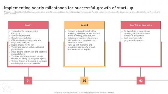 The purpose of this slide is to facilitate managers to convey project progress updates to stakeholders and get their approvals. The slide portrays key milestones of the daycare start-up to be achieved in the year 1, year 3, and years 5 onwards. Formulating a presentation can take up a lot of effort and time, so the content and message should always be the primary focus. The visuals of the PowerPoint can enhance the presenters message, so our Implementing Yearly Milestones For Successful Growth Childcare Business Plan Designs Pdf was created to help save time. Instead of worrying about the design, the presenter can concentrate on the message while our designers work on creating the ideal templates for whatever situation is needed. Slidegeeks has experts for everything from amazing designs to valuable content, we have put everything into Implementing Yearly Milestones For Successful Growth Childcare Business Plan Designs Pdf The purpose of this slide is to facilitate managers to convey project progress updates to stakeholders and get their approvals. The slide portrays key milestones of the daycare start-up to be achieved in the year 1, year 3, and years 5 onwards.