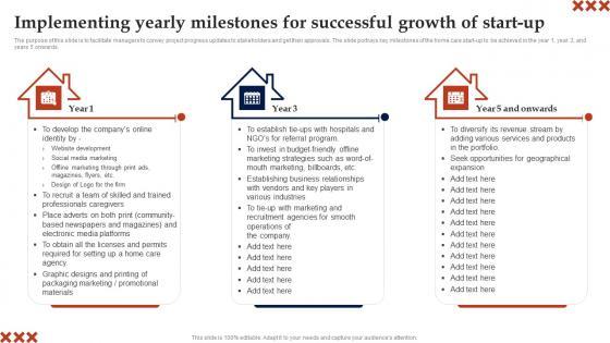 The purpose of this slide is to facilitate managers to convey project progress updates to stakeholders and get their approvals. The slide portrays key milestones of the home care start-up to be achieved in the year 1, year 3, and years 5 onwards. Formulating a presentation can take up a lot of effort and time, so the content and message should always be the primary focus. The visuals of the PowerPoint can enhance the presenters message, so our Implementing Yearly Milestones For Successful In Home Care Business Plan Elements Pdf was created to help save time. Instead of worrying about the design, the presenter can concentrate on the message while our designers work on creating the ideal templates for whatever situation is needed. Slidegeeks has experts for everything from amazing designs to valuable content, we have put everything into Implementing Yearly Milestones For Successful In Home Care Business Plan Elements Pdf The purpose of this slide is to facilitate managers to convey project progress updates to stakeholders and get their approvals. The slide portrays key milestones of the home care start-up to be achieved in the year 1, year 3, and years 5 onwards.