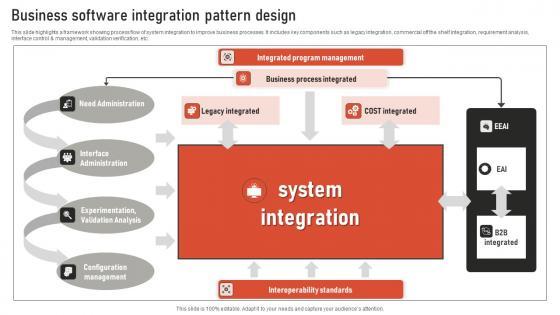 This slide highlights a framework showing process flow of system integration to improve business processes. It includes key components such as legacy integration, commercial off the shelf integration, requirement analysis, interface control and management, validation verification, etc. Showcasing this set of slides titled Business Software Integration Pattern Design Template Pdf. The topics addressed in these templates are Interface Administration, Experimentation, Validation Analysis, Configuration Management. All the content presented in this PPT design is completely editable. Download it and make adjustments in color, background, font etc. as per your unique business setting. This slide highlights a framework showing process flow of system integration to improve business processes. It includes key components such as legacy integration, commercial off the shelf integration, requirement analysis, interface control and management, validation verification, etc.