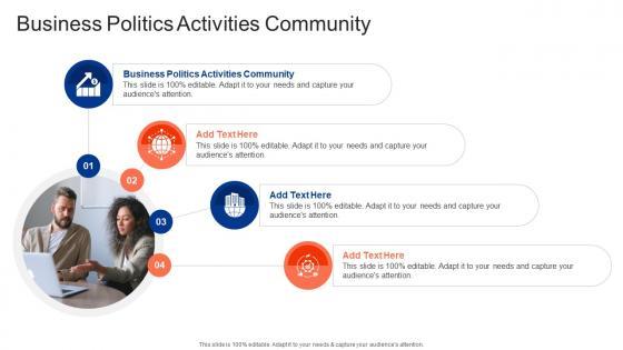 Presenting our innovatively-designed set of slides titled Business Politics Activities Community In Powerpoint And Google Slides Cpb. This completely editable PowerPoint graphic exhibits Business Politics Activities Community that will help you convey the message impactfully. It can be accessed with Google Slides and is available in both standard screen and widescreen aspect ratios. Apart from this, you can download this well-structured PowerPoint template design in different formats like PDF, JPG, and PNG. So, click the download button now to gain full access to this PPT design. Our Business Politics Activities Community In Powerpoint And Google Slides Cpb are topically designed to provide an attractive backdrop to any subject. Use them to look like a presentation pro.